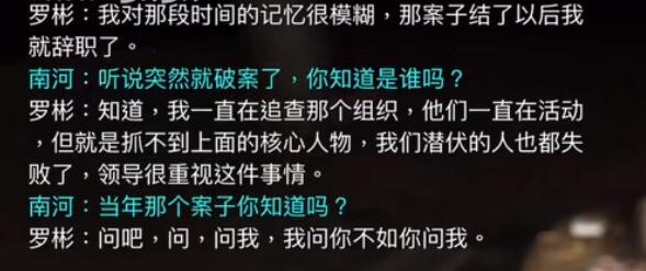 获得行李箱里的所有物件线索后回来烧烤店旁边和罗彬再度开展会话,点一下“当初那一个案件你清楚吗?”